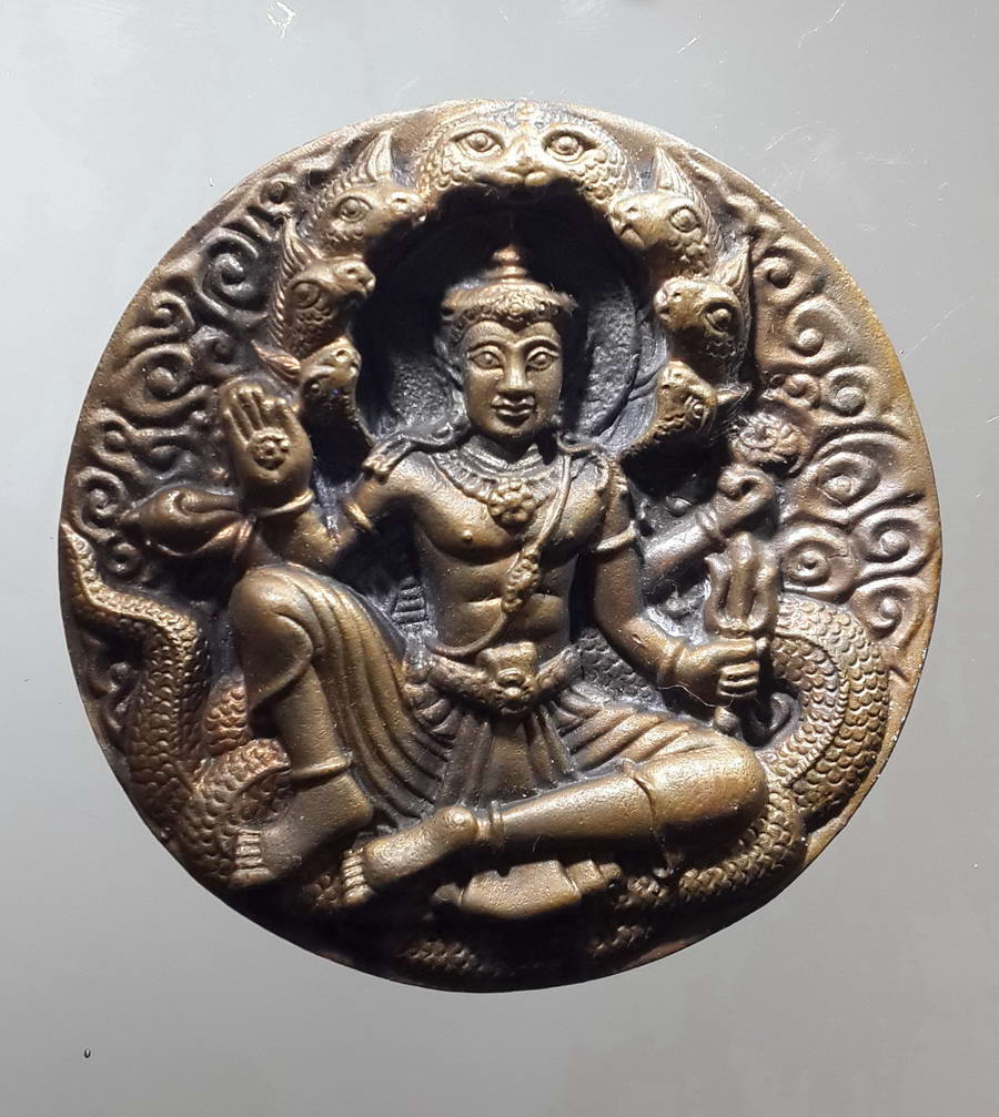 ด้านหน้า องค์พระเทวราชโพธิสัตว์ จัตตุคาม-รามเทพ ประทับนั่งบนพญานาคา 7 เศียร ณ บนสรวงสวรรค์ชั้นฟ้า พระ